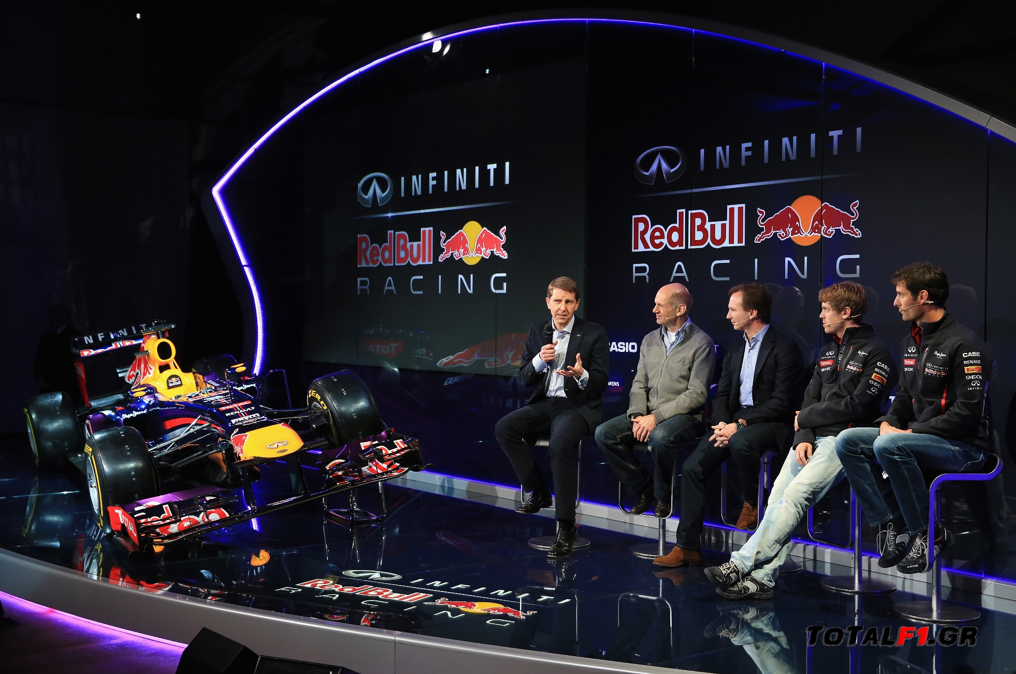 Η Red Bull RB9 στα sidepods είχε μεγάλα αυτοκόλλητα του νέου της χορηγού της Infinity που από φέτος θα υπάρχει και στο λογότυπο της ομάδας, ενώ όπως είδαμε στο μονοθέσιο υπάρχει φέτος και ανοιχτό μωβ χρώμα που δίνει μια άλλη αίσθηση στην εμφάνιση της Red Bull.