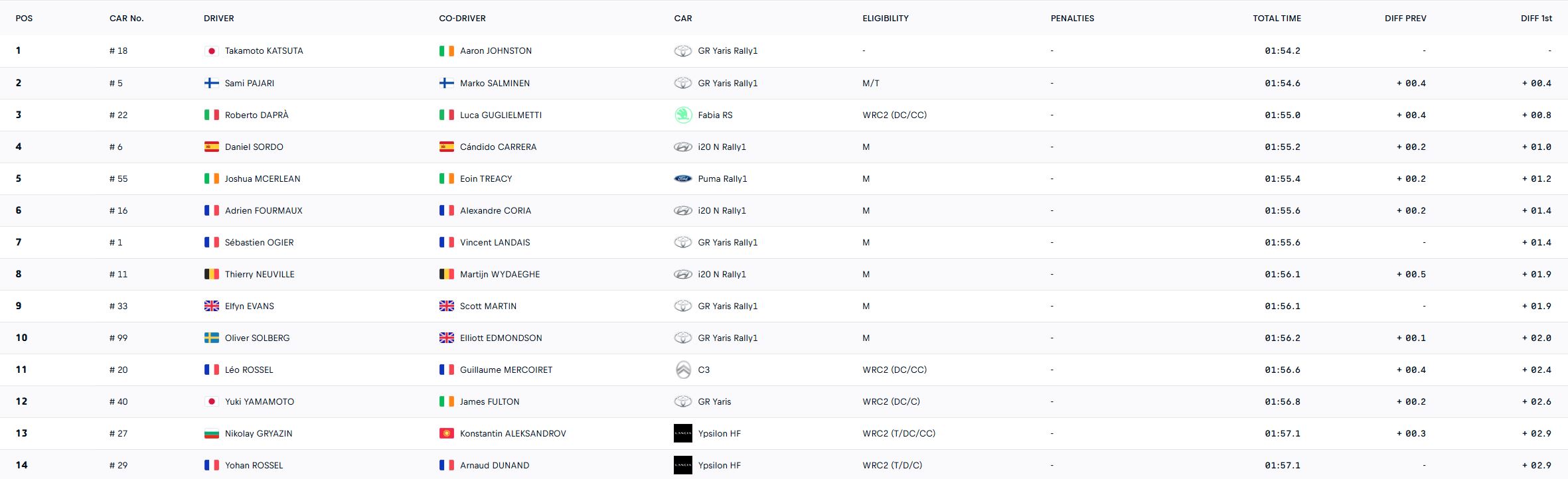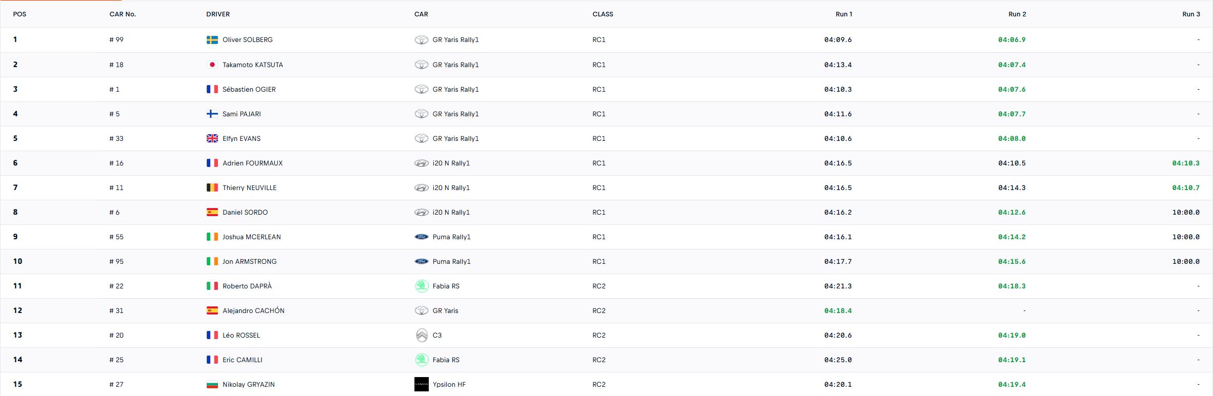 Την δεκάδα συμπλήρωσαν οι Thierry Neuville, Elfyn Evans, με τις δύο να σημειώνουν τον ίδιο χρόνο, και ο Oliver Solberg.