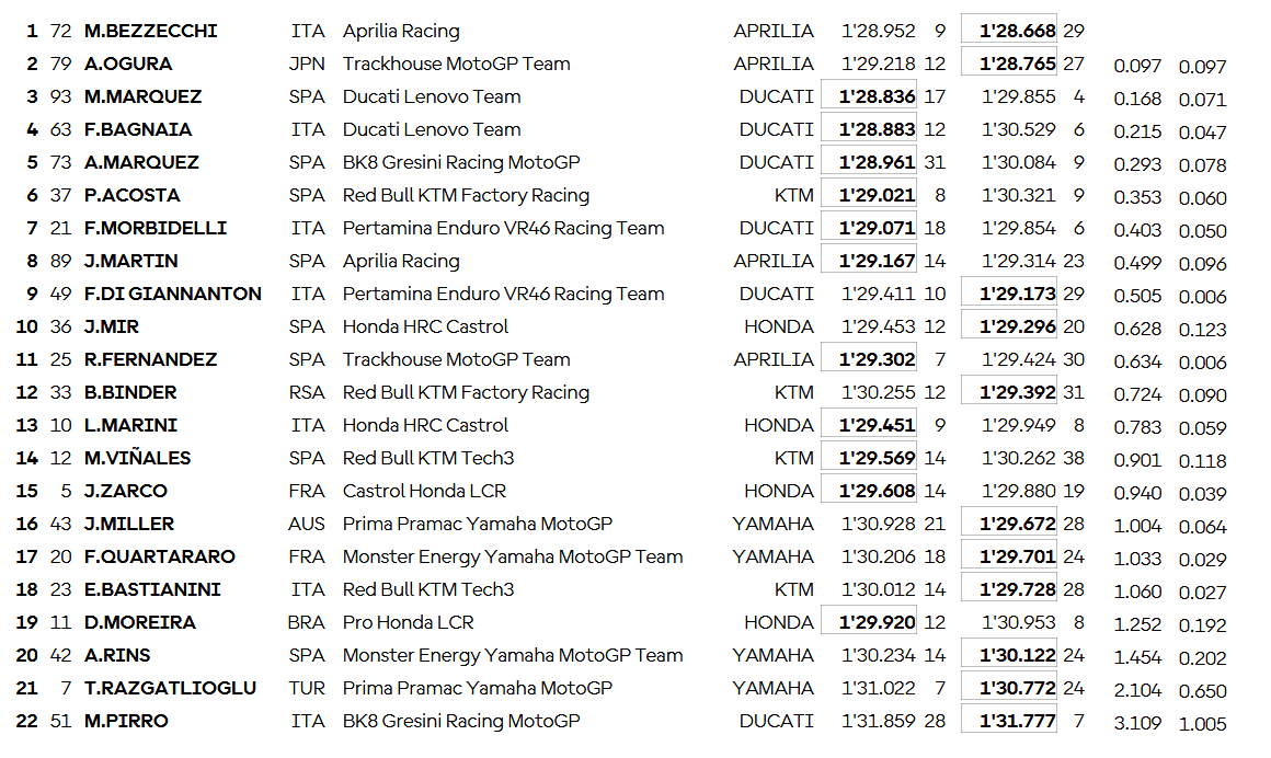 Οι δύο αναβάτες των ιταλικών μοτοσυκλετών, υπερκέρασαν τους δύο αναβάτες της εργοστασιακής Ducati, που είχαν το προβάδισμα στο πρώτο μισό της ημέρας. Marc Marquez και Pecco Bagnaia είχαν σημειώσει παραπλήσιους χρόνους και πήραν τελικά την τρίτη και τέταρτη θέση αντίστοιχα. Ο παγκόσμιος πρωταθλητής είχε ένα σχετικά επεισοδιακό απόγευμα, καθώς είχε και σήμερα μία πτώση, ενώ λόγω της γαστρεντερίτιδας που τον ταλαιπωρεί επισκέφτηκε το ιατρικό κέντρο της πίστας προτού επιστρέψει στη δράση.