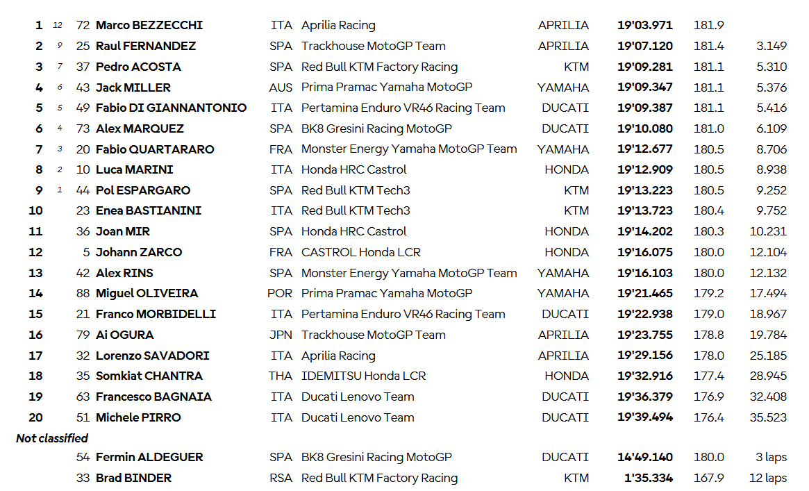 Ο Ιταλός τελικά πέρασε μπροστά και πανηγύρισε ακόμα μία νίκη σε αγώνα σπριντ φέτος, κάτι που φαίνεται να έχει ανάγει σε συνήθεια. Ο Raul Fernandez πήρε ένα πολύ καλό αποτέλεσμα για τον ίδιο, αλλά και για την Trackhouse Aprilia, αφού κρατήθηκε μπροστά από τον Acosta, που τελικά πήρε την καρώ σημαία τρίτος.