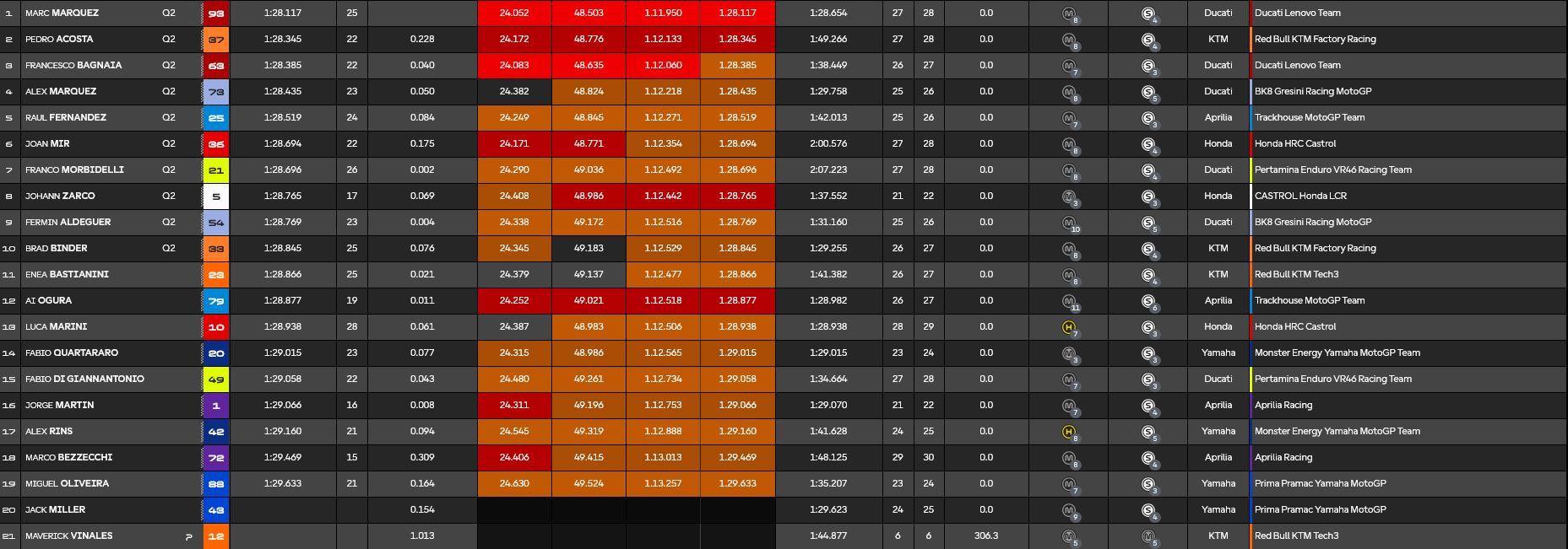 O Franco Morbidelli με την VR46 και ο Fermin Aldeguer με την έτερη Gresini μπήκαν επίσης στην πρώτη δεκάδα, με την έβδομη κι ένατη θέση αντιστοίχως. Ανάμεσά τους ήταν η LCR Honda του Johann Zarco, ενώ την δεκάδα που πήρε το απευθείας εισιτήριο για το Q2 των κατατακτηρίων του Σαββάτου έκλεισε ο Brad Binder, ο οποίος επικράτησε σε μία τρομερά κλειστή μάχη με τους Enea Bastianini, Ai Ogura, Luca Marini και Fabio Quartararo, οι οποίοι θα περάσουν από το Q1, μαζί με τους υπόλοιπους της κατάταξης. Εκεί θα βρεθεί και ο Jorge Martin, που κατέλαβε μόλις την 16η θέση, όντας πάντως ταχύτερος από την έτερη εργοστασιακή Aprilia του Marco Bezzecchi.