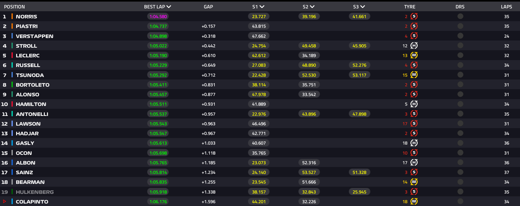 Την δεκάδα ολοκλήρωσαν οι Yuki Tsunoda, Gabriel Bortoleto, Fernando Alonso και Lewis Hamilton, με την βελτίωση της Kick Sauber να είναι κάτι παραπάνω από εμφανής. Επιπλέον ο επτάκις παγκόσμιος πρωταθλητής θα παραπεμφθεί στους αγωνοδίκες καθώς παρεμπόδισε την προσπάθεια του ενδέκατου Kimi Antonelli.