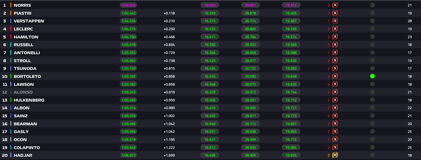 Οι ταχύτεροι γύροι έγιναν στο τελευταίο τέταρτο της διαδικασίας, με τον Lando Norris να διατηρεί το προβάδισμα που πήρε χθες έναντι του Oscar Piastri. Οι οδηγοί της McLaren έκαναν πάλι το 1-2, με τον Βρετανό να σταματάει τα χρονόμετρα σε 1:04,324 και να είναι ένα δέκατο του δευτερολέπτου ταχύτερος από τον Αυστραλό teammate του.