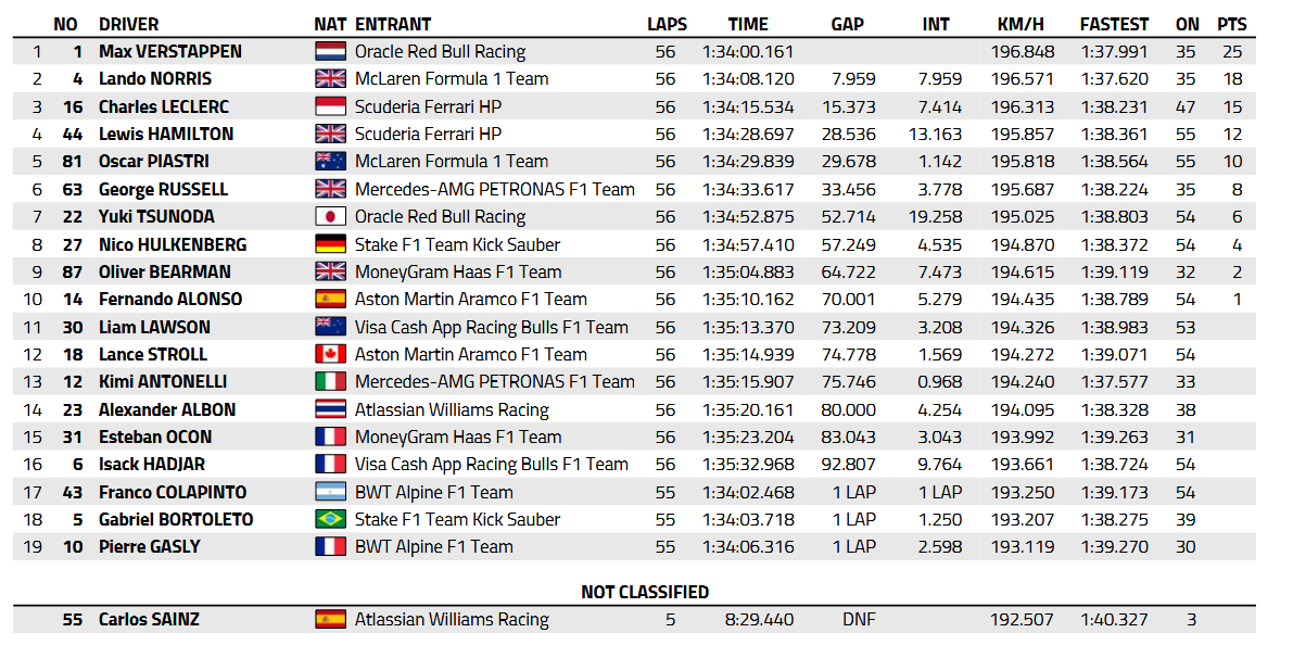 Στη διαφορά των πλέον 40 βαθμών συνηγόρισε και η απελπιστική εμφάνιση του Oscar Piastri, ο οποίος περισσότερο απειλήθηκε από τον έκτο Russell παρά απείλησε τον τέταρτο Hamilton, μένοντας για ακόμη έναν αγώνα μακριά από το βάθρο, στο οποίο είχε βρεθεί συνεχόμενες φορές στο πρώτο μισό της σεζόν.