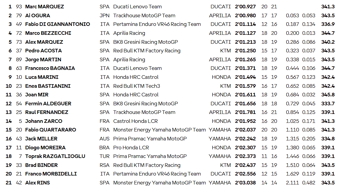 Με έναν πολύ γρήγορο γύρο στο φινάλε των δοκιμών ο Marc Marquez ανέκαμψε από την τρομακτική πτώση του FP1 και πήρε την πρώτη θέση στις δοκιμές του Grand Prix των Ηνωμένων Πολιτειών της Αμερικής, οριακά μπροστά από τον εντυπωσιακό Ai Ogura. Συνέχισε ψηλά ο Di Giannantonio, τρομερή μάχη για την δεκάδα.