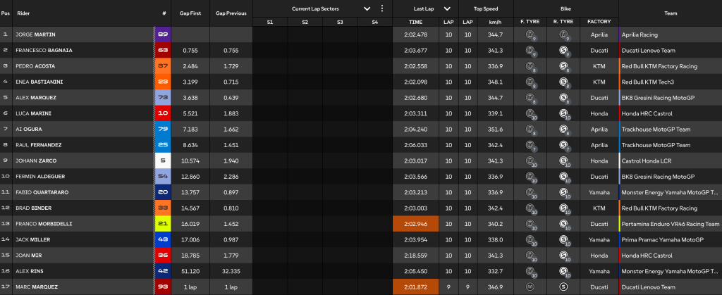 Το δράμα ξεκίνησε πριν καν ολοκληρωθεί ο πρώτος γύρος, με τον Marquez να επιχειρεί μεγάλη βουτιά στην στροφή πριν την πίσω ευθεία και να έχει lowside, ρίχνοντας μαζί του τον Di Giannantonio. Στον αντίποδα, ο Bagnaia προσπαθούσε να ξεφύγει από τον Acosta, ενώ οι Mir, Martin, Bezzecchi και Alex Marquez ακολουθούσαν από κοντά, σε ένα μικρό τρενάκι.