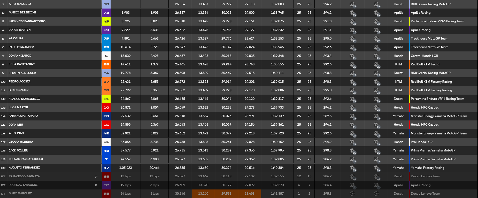 Η εφιαλτική μέρα για την εργοστασιακή ομάδα της Ducati, μία ημέρα μετά το 1-2 στο sprint, ολοκληρώθηκε με την μηχανική εγκατάλειψη του Pecco Bagnaia στον 13ο γύρο του αγώνα. Με την κατάσταση να έχει σταθεροποιηθεί και τις διαφορές στην πρώτη πεντάδα να αυξάνονται, το ενδιαφέρον ήταν στη μάχη για την έβδομη θέση, ανάμεσα σε Enea Bastianini κι Ai Ogura. Ο Ιάπωνας δοκίμασε δύο φορές να περάσει, ο αναβάτης της Tech3 KTM απάντησε αμφότερες τις φορές, όμως η τρίτη ήταν κι η φαρμακερή, με την Trackhouse να περνάει μπροστά.
