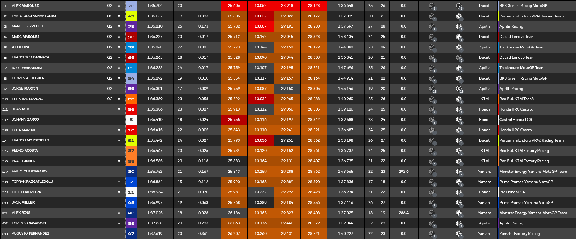 Marc Marquez κι Ai Ogura έμειναν ψηλά, παρά τα σκόρπια προβλήματα που είχαν στα πρώτα λεπτά, οι πρώην πρωταθλητές Pecco Bagnaia και Jorge Martin ξεπέρασαν τις πτώσεις του πρώτου μισού, Raul Fernandez και Fermin Aldeguer βρήκαν ταχύτατους χρόνους στο φινάλε, ενώ ο Enea Bastianini κατάφερε να πάρει μία ηρωική πρόκριση στο φινάλε, όντας ο μόνος αναβάτης εκτός Ducati κι Aprilia που κατάφερε να μπει στη δεκάδα.