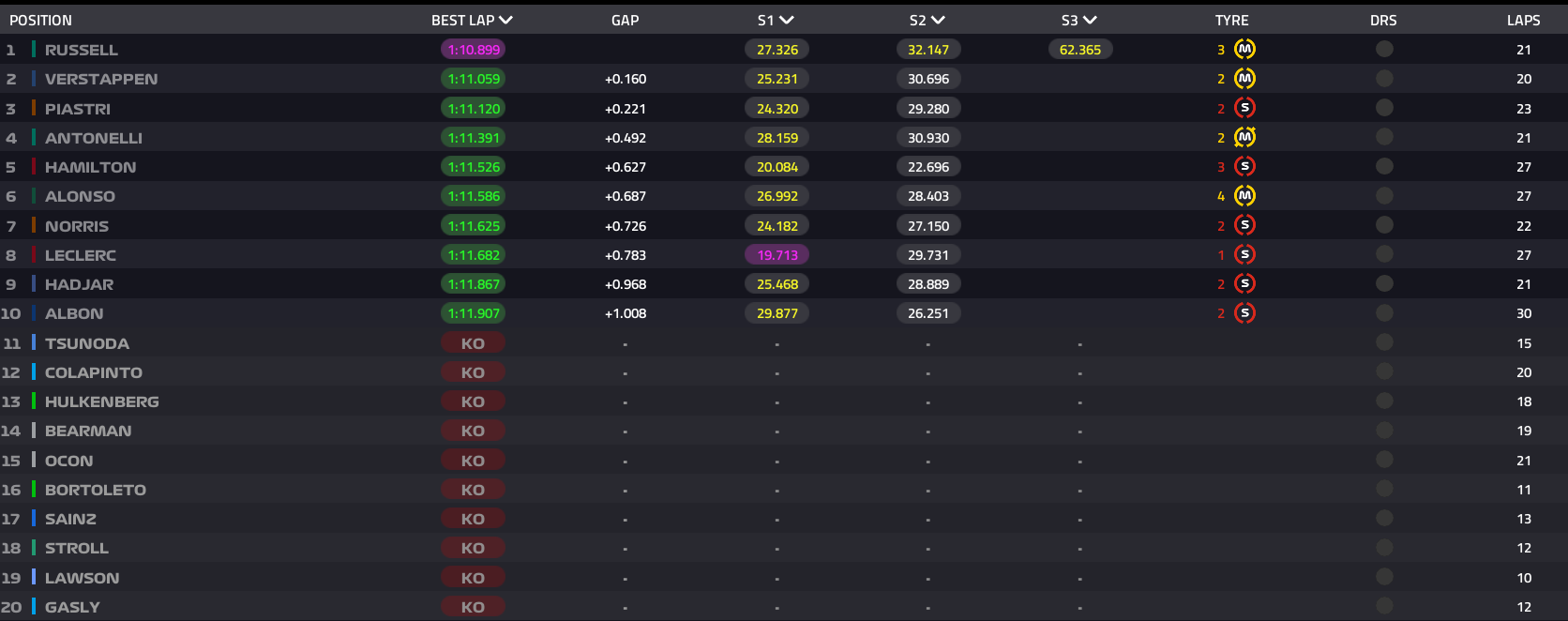 Από την τέταρτη και πέμπτη θέση αντίστοιχα θα εκκινήσουν οι Kimi Antonelli και Lewis Hamilton, που πήραν τα μέγιστα από τα μονοθέσιά τους. Ακολουθεί στην πέμπτη θέση ο Fernando Alonso, ο οποίος συνεχίζει να εκπλήσσει άπαντες με τις επιδόσεις του.