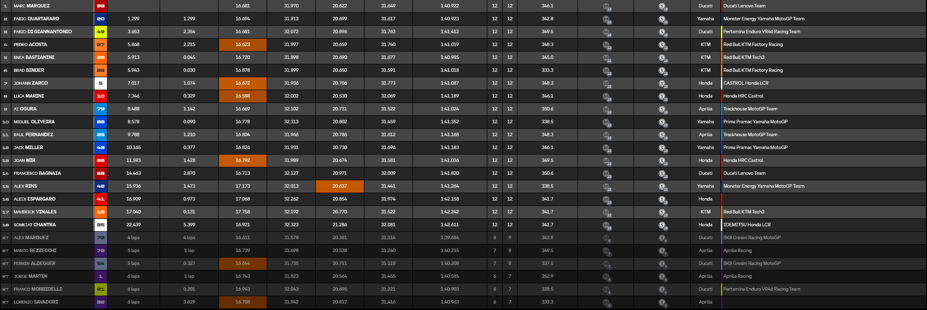 Οι δύο Honda των Zarco και Marini κατάφεραν να μπουν στους βαθμούς με την έβδομη κι όγδοη θέση αντίστοιχα, ενώ την τελευταία βαθμολογούμενη θέση πήρε ο Ai Ogura. Από την μεριά του ο Pecco Bagnaia έμεινε στην 14η θέση, εκμεταλλευόμενος περισσότερο τις πτώσεις των αναβατών μπροστά του.
