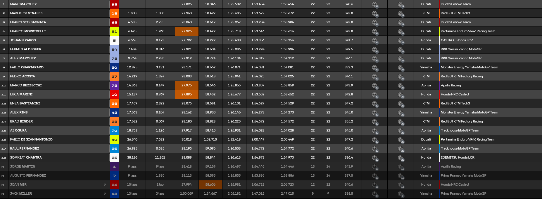 Ο Bagnaia δυσκολεύτηκε περισσότερο να περάσει τον συμπατριώτη του, ο οποίος πάντως παρά τη σθεναρή του αντίσταση, βρήκε την ευκαιρία και με υπομονή πήρε την τρίτη θέση, έχοντας χάσει σχεδόν ένα δευτερόλεπτο από τους δύο πρωτοπόρους.