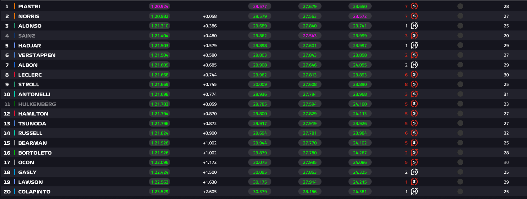 Υπό αυτή την συνθήκη, ταχύτερος όλων ήταν ο Oscar Piastri με τον πρωτοπόρο στο πρωτάθλημα οδηγών να σταματά το χρονόμετρο σε 1:20.982. Την τριάδα συμπλήρωσαν οι έτεροι διεκδικητές του τίτλο, με τον Lando Norris να γράφει τον δεύτερο χρόνο. Στα τελευταία λεπτά την μεγάλη έκπληξη έκανε ο Fernando Alonso καθώς ο πιλότος της Aston Martin αναρριχίθηκε στην τρίτη θέση, τρία δέκατα πίσω από τις McLaren.