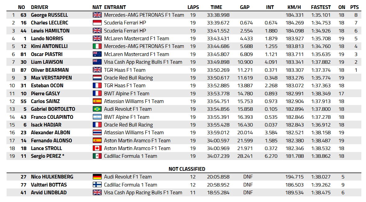 Εκτός από τον Hulkenberg από τον αγώνα εγκατέλειψαν οι Valtteri Bottas και Arvid Lindblad, ενώ με ζημιά στα πλαϊνά αεροδυναμικά και με την λάθος επιλογή της μαλακής γόμας στην εκκίνηση, ο Isack Hadjar έμεινε μόλις στην 15η θέση, παρά την καλή του εκκίνηση.