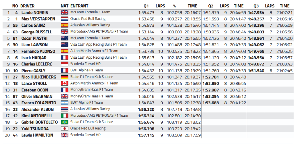 Ο Russell έγραψε εκ νέου τον ταχύτερο χρόνο της διαδικασίας, με τους Isack Hadjar και Carlos Sainz να επιδεικνύουν άριστη απόδοση, τους Norris και Verstappen να προκρίνονται άνετα, εν αντιθέσει τον Oscar Piastri που συμπλήρωσε την πρώτη δεκάδα, κινδυνεύοντας με αποκλεισμό στο φινάλε. Εντυπωσιακός ήταν και ο γύρος του Pierre Gasly που τον έφερε στο Q3 για δεύτερο συνεχόμενο αγώνα, σε βάρος του Nico Hulkenberg.
