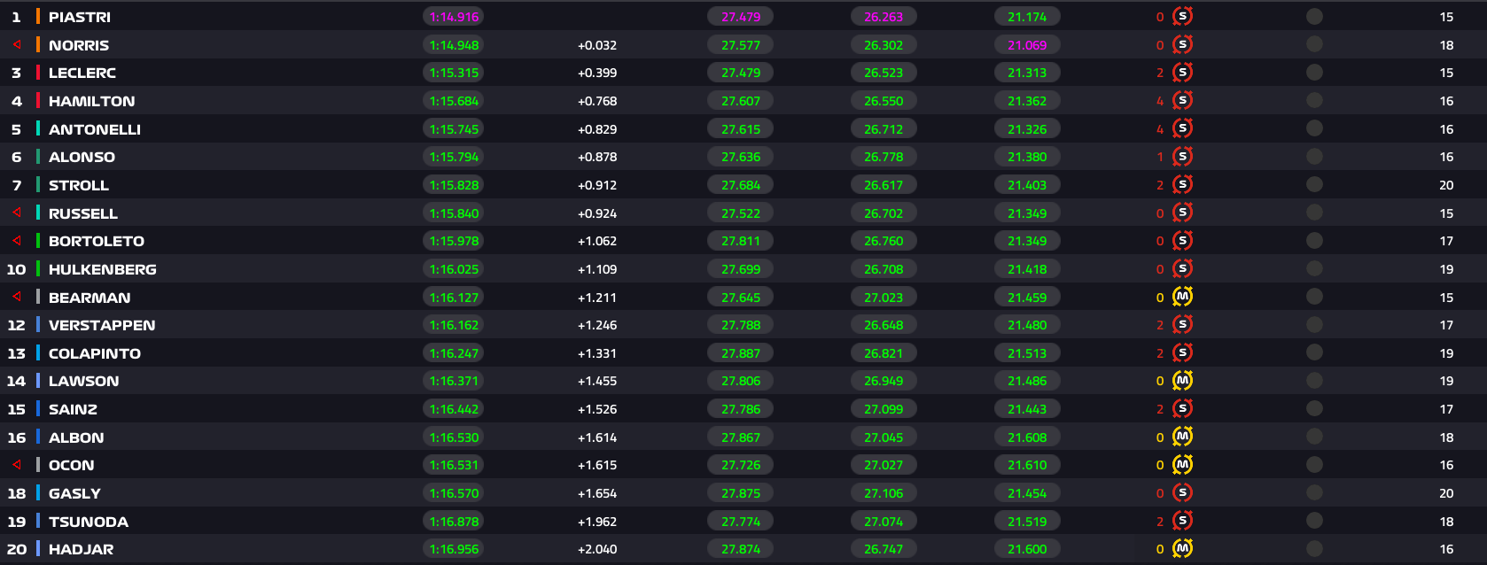 Στο ίδιο δέκατο του δευτερολέπτου βρέθηκε και ο Lando Norris, ο οποίος ήταν 32 χιλιοστά πιο αργός από τον teammate του. Αμφότεροι οι οδηγοί της McLaren ήταν ταχύτεροι από τον χρόνο που έδωσε στον Norris την περσινή pole position στην ίδια πίστα, με τον Piastri μάλιστα να κάνει και το ταχύτερο πρώτο sector, στο οποίο η βρετανική ομάδα έχανε αρκετό χρόνο στις δοκιμές της Παρασκευής.