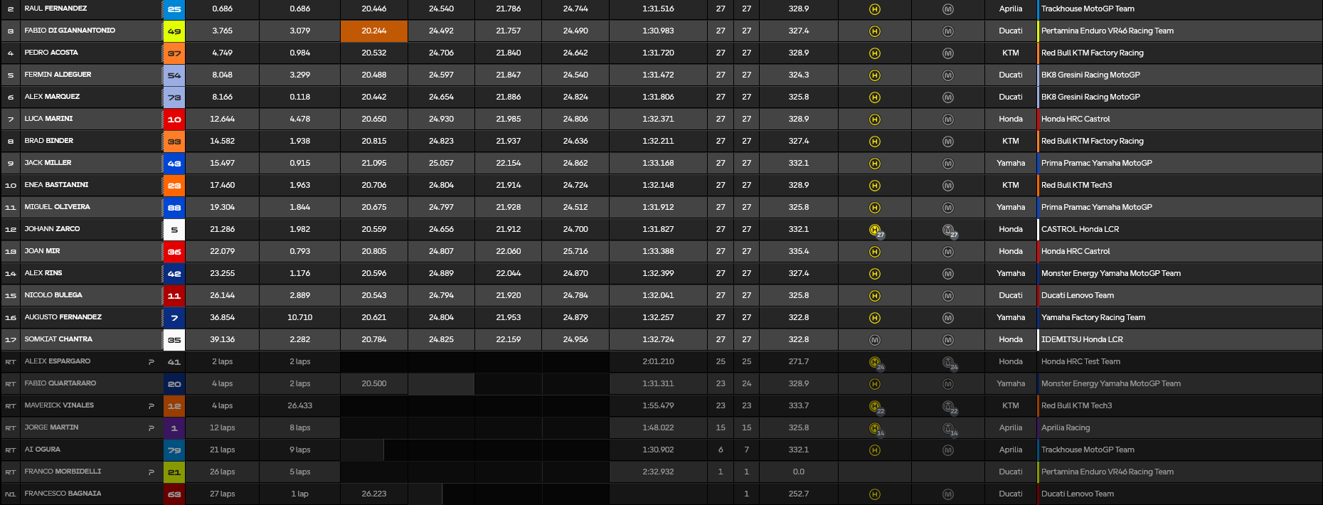 Ο Zarco τιμωρήθηκε με ποινή long lap, ενώ ο Bagnaia επέστρεψε εμφανώς απογοητευμένος στην ολοκλήρωση μίας εφιαλτικής σεζόν. Μπροστά Bezzecchi και Marquez επέκτειναν το προβάδισμά τους από τον Di Giannantonio, ο οποίος με τη σειρά του δεχόταν την πίεση των Fernandez κι Acosta.