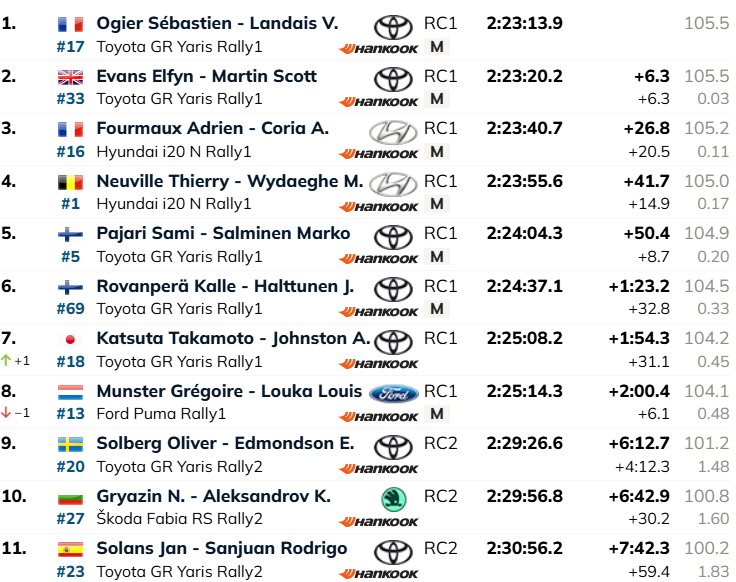 Πιο πίσω, ο Sami Pajari δεν απείλησε αλλά ούτε και απειλήθηκε. Ο νεαρός Φινλανδός, κατέλαβε την πέμπτη θέση, έχοντας κατά διαστήματα έναν αρκετά γρήγορο ρυθμό και βρισκόταν κοντά στις πρώτες θέσεις. Έκτος, βρίσκεται ακόμα ένας συμπατριώτης του, ο Kalle Rovanpera, ο οποίος μετά τις εγκαταλείψεις των Tanak,McErlean και Heller ήταν εκείνος που άνοιγε κάθε ειδική διαδρομή και πλέον εστιάζει στους επιπλέον βαθμούς της Κυριακής, που θα τον κρατήσουν ζεστό στην μάχη για την κατάκτηση του τίτλου.