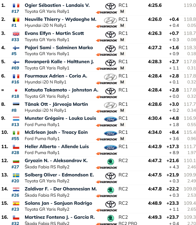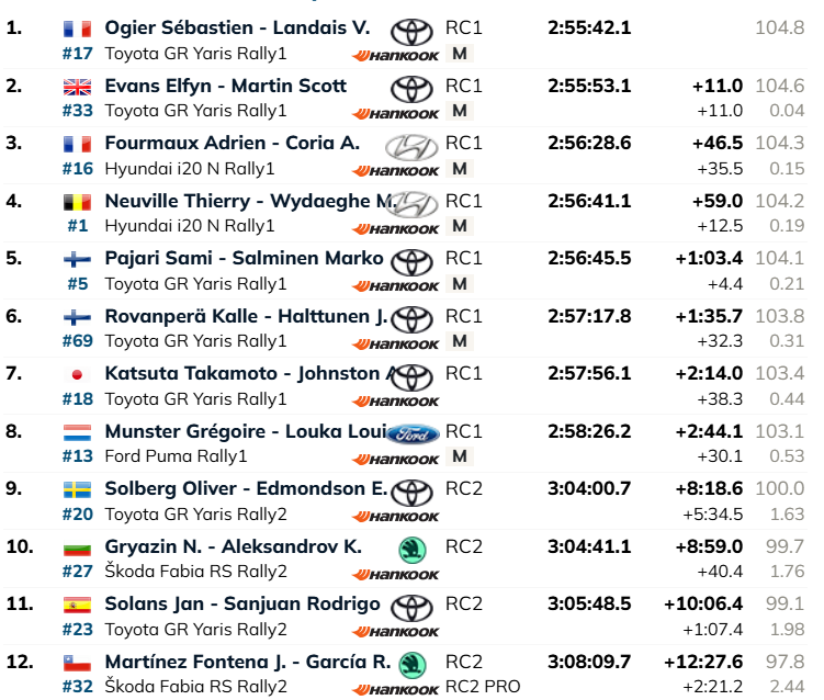 O Sebastien Ogier, παρέδωσε σεμινάριο πρωταθλητισμού στις τέσσερις τελευταίες ειδικές, κρατώντας τον Elfyn Evans πίσω του, με τον Ουαλό να μην μπορεί να πλησιάσει τον ρυθμό του οκτάκις πρωταθλητή. Ο οδηγός της Toyota ήταν εκείνος που κατέκτησε την νίκη και με άνεση, δίνοντας μάχη με τον ομόσταυλό του για την πρωτιά στην Super Sunday. Ο Γάλλος πήρε την πρωτιά κι εκεί, προσπερνώντας τον Evans και στο πρωτάθλημα, το οποίο πλέον είναι στην κόψη του ξυραφιού.