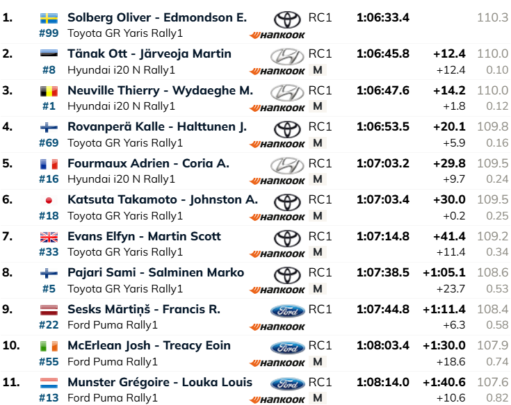 Ξενοδόχο που ακούει στο όνομα Oliver Solberg! Ενάμιση χρόνο μετά την τρίτη θέση γενικής στην Σουηδία την Παρασκευή , η επιστροφή του στην κορυφαία κατηγορία συνοδεύτηκε με τον καλύτερο δυνατό τρόπο. Με την πρωτοπορία στην γενική κατάταξη μετά το πέρας της πρώτης μέρας. Έχοντας σύμμαχο την καλή θέση εκκίνησης όπως αποδείχτηκε, κινήθηκε ταχύτατα σε όλη τη διάρκεια του σκέλους και κέρδισε τρεις ειδικές διαδρομές, διατηρώντας με μαεστρία πίσω τους τους Ott Tanak και Thierry Neuville, που ήταν αυτοί που συμπλήρωσαν την πρώτη τριάδα έχοντας διψήφια διαφορά τόσο από τον Εσθονό όσο και από τον Βέλγο.