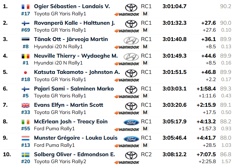 Στις τρεις ειδικές, που άνοιξαν την αυλαία του πρωινού loop του Σαββάτου, υπήρξαν τρεις διαφορετικοί νικητές (Sebastien Ogier, Takamoto Katsuta και Thierry Neuville) και δύο πρωταγωνιστές. Αφ’ενός ο Ott Tanak, που διεύρυνε σταθερά την διαφορά του από τον οκτάκις πρωταθλητή και αφετέρου ο νεαρός Sami Pajari, που κράτησε με χαρακτηριστική άνεση πίσω του τον Elfyn Evans με αμφότερους να έχουν τον ίδιο ρόλο, τον καθαρισμό του δρόμου για τα υπόλοιπα πληρώματα.