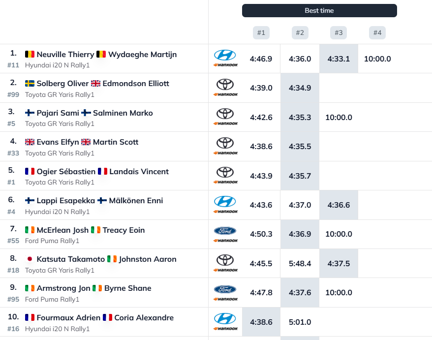 Δίπλα από τον εννιά φορές παγκόσμιο πρωταθλητή, στην έκτη θέση βρίσκεται ο Esapekka Lappi. O Φινλανδός χρειάστηκε κι εκείνος τρία περάσματα προκειμένου να βρει το ταχύτερο (4:36.9). Το 7-9 στην κατάταξη έκαναν οι δύο Ιρλανδοί της M-Sport WRT, Josh McErlean και Jon Armstrong, με τον Takamoto Katsuta να μπαίνει ανάμεσά τους, όντας όγδοος και τον Adrien Fourmaux να κλειδώνει τη δεκάδα.