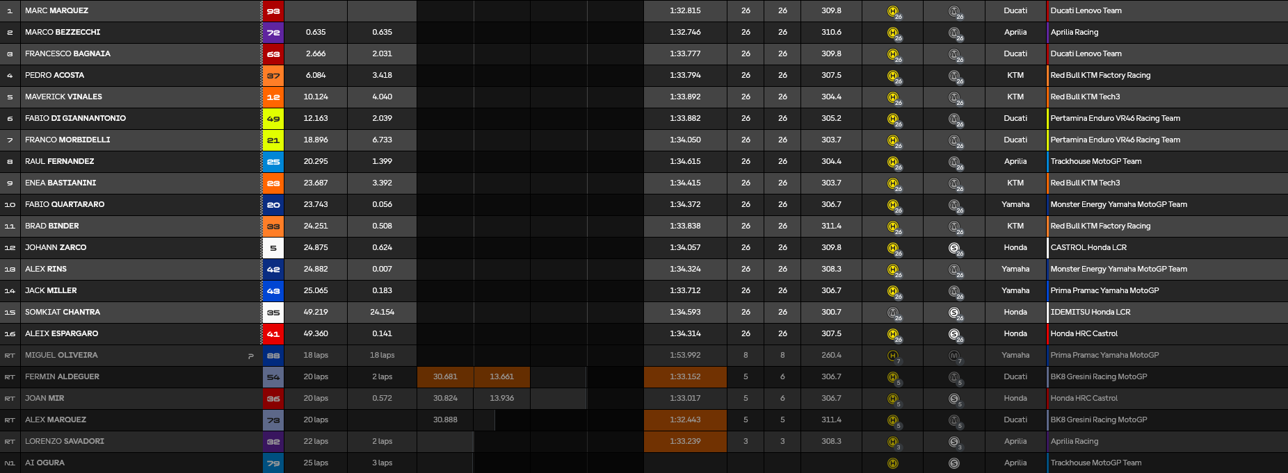 Ο δεύτερος Bezzecchi γνώρισε την αποθέωση από τον κόσμο και τους μηχανικούς της Aprilia για το δεύτερο συνεχόμενο βάθρο, μετά το χθεσινό στο sprint, ενώ ο τρίτος Bagnaia, μπόρεσε να βρει έστω την παρηγοριά του βάθρου, σε ένα ακόμη δύσκολο αποτέλεσμα για αυτόν.