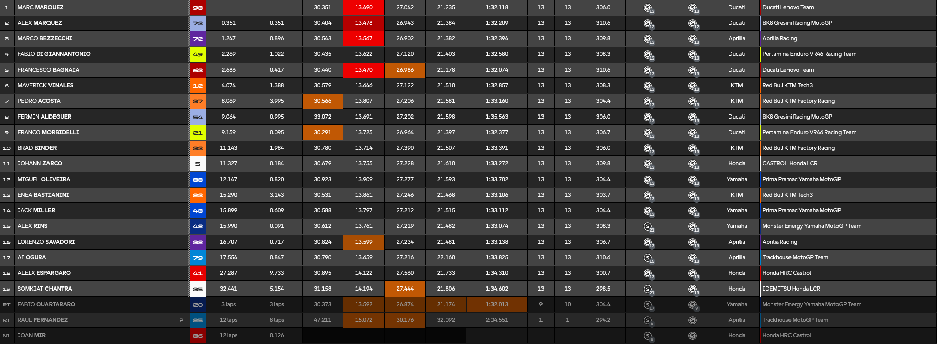 Η πρώτη επτάδα είχε ξεχωρίσει κι ήταν σε απόσταση δύο δευτερολέπτων, με τον Maverick Vinales να ακολουθεί σε μικρή απόσταση τον Bagnaia, δίχως όμως να μπορεί να απειλήσει για κάποιο προσπέρασμα.